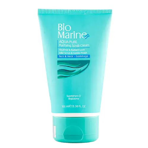 اسکراب و لایهبردار صورت و گردن بایو مارین، حاوی عصارههای طبیعی مانند جلبک دریایی، آلوئهورا و روغن جوانه گندم است که به پاکسازی عمیق پوست، حذف سلولهای مرده و بهبود بافت آن کمک میکند.