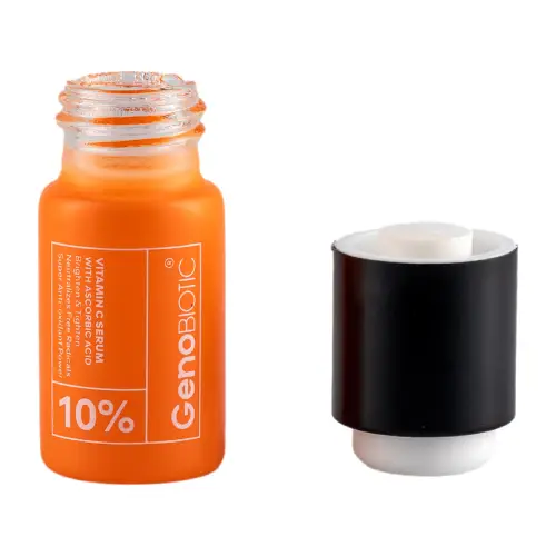 سرم ویتامین C ژنوبایوتیک با فرم پایدار ویتامین C (آسکوربیک اسید یا منیزیم آسکوربیل فسفات ۱۰٪) ویتامین E و هیالورونیکاسید، برای روشنسازی، یکنواختسازی رنگ پوست، آبرسانی و تحریک کلاژنسازی طراحی شده است.