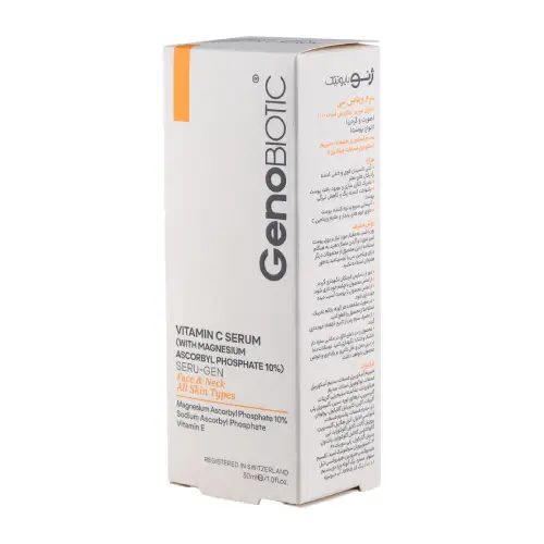 سرم ویتامین C ژنوبایوتیک با فرم پایدار ویتامین C (آسکوربیک اسید یا منیزیم آسکوربیل فسفات ۱۰٪) ویتامین E و هیالورونیکاسید، برای روشنسازی، یکنواختسازی رنگ پوست، آبرسانی و تحریک کلاژنسازی طراحی شده است.