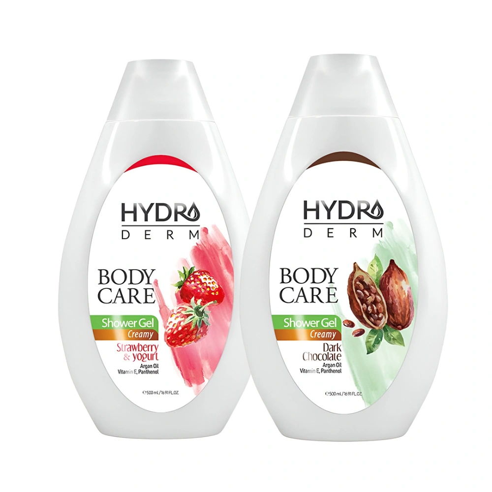 - محصول دو: شامپو بدن کرمی ماست و توت فرنگی هیدرودرم (500ml)، شوینده و پاک کننده ملایم غیر صابونی.