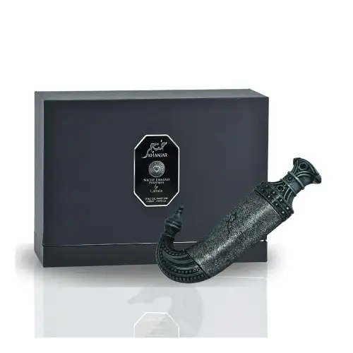 لطافه ادو پرفیوم مردانه خنجر عطری قدرتمند، ادویهای چرمدار و چرمی با ترکیبی از گرمای زنجبیل و جوز هندی در آغاز، قلب پودری کشمیران با پچولی و بنفشه، و پایهای دودی از چرم، بخور، وتیور و مشک—مناسب آقایان جسور و مجالس رسمی زمستانی است.