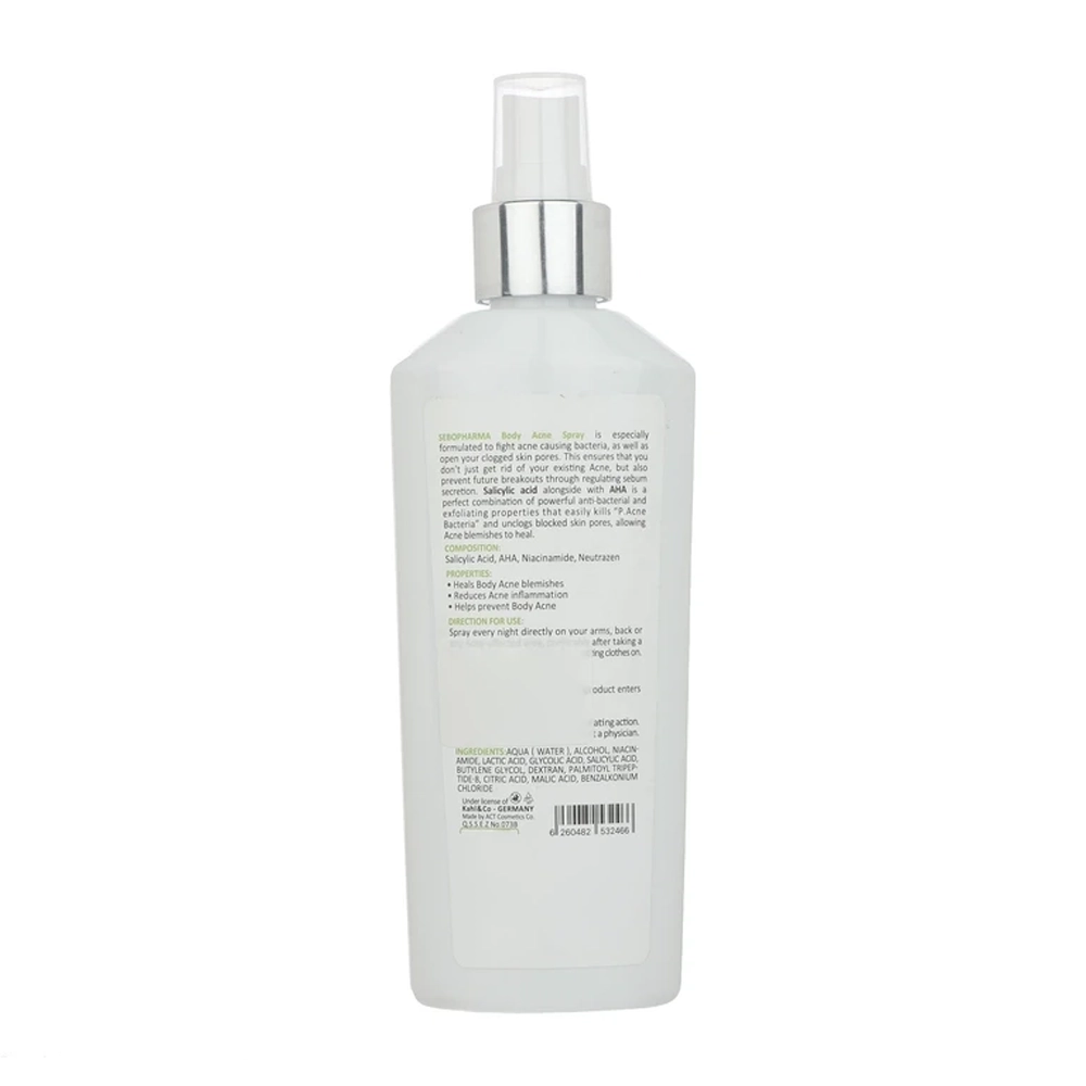 اسپری ضد جوش مای مدل سبوفارما، یک محصول درمان جوش بدن است که برای نواحی مثل، پشت، شانه و سینه طراحی شده است. این اسپری با باز کردن منافذ، کنترل چربی اضافی پوست و مقابله با باکتری های ایجاد کننده جوش، به کاهش و پیشگیری از آکنه کمک می کند. همچنین التهاب پوست را کاهش داده و پوست های حساس و مستعد جوش را تسکین می دهد. این اسپری دارای ترکیبات فعال همچون سالیسیلیک اسید، AHA، نیاسینامید و عصاره های گیاهی می باشد که به پاکسازی منافذ و به کاهش جوش بدن کمک می کند. عصاره های گیاهی موجود در فرمولاسیون آن، التهابات و قرمزی پوست را کاهش داده و باعث تسکین پوست های مستعد آکنه می شود. این ترکیبات با هم علاوه به درمان جوش، از بروز جوش های جدید نیز پیشگیری می کند.- پاکسازی منافذ: با ترکیبات لایه بردار مثل سالیسیلیک اسید، سلول های مرده پوست را حذف می کند.