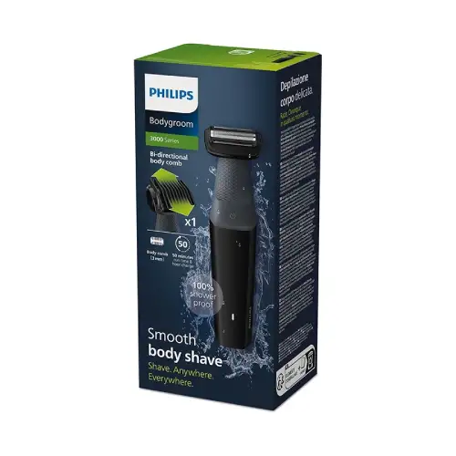 ماشین اصلاح بدن سری 3000 مدل BG3017/01 فیلیپس با فناوری 2 D برای دنبالکردن انحنای پوست و شانهی 3 میلیمتری یک کلیکی، اصلاحی دقیق و ملایم حتی در نواحی حساس ارائه میدهد. کاملاً ضدآب و قابل شستوشو، باتری Ni-MH با شارژ کامل 8 ساعت برای 50 دقیقه استفادهی بدون سیم دارد.