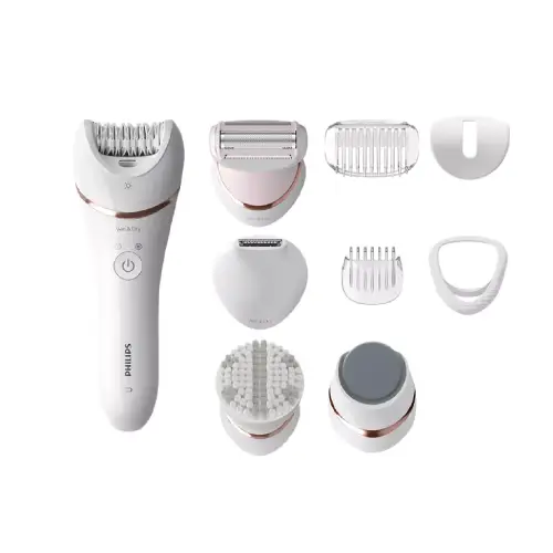 - ابزار جانبی متعدد شامل: شانه برای مناطق حساس، تیغه شیو، سر برش بیکینی با شانه، برس لایهبرداری بدن (48,200 موچهی هیپوآلرژنیک)، سوهان چرخان پدیکور، محافظ برای نواحی ظریف، پوشش تماس بهینه، برس تمیزکننده و کیف نگهدارنده.