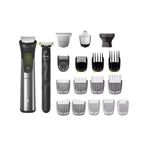- مجموعه 20 ابزار کاربردی برای اصلاح همهجانبه شامل تریمر استیل، تریمر دقیق، شیوِر بدن با محافظ پوست، دسته و تیغه OneBlade، کلیپر عریض ۴۱ میلیمتری، شانههای متغیر برای مو، بدن، ابرو، و ابزارهای فیدینگ.
