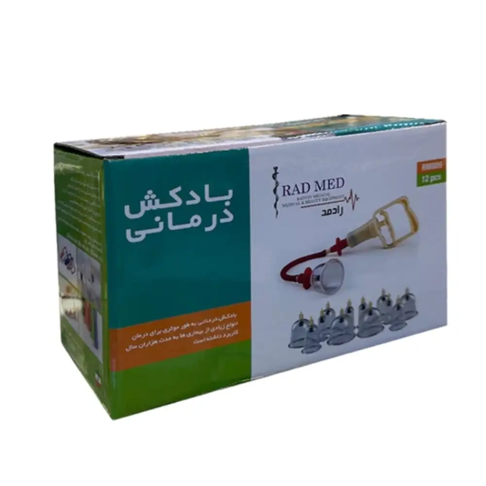 ست بادکش Rad Med 12-Cup یک دستگاه بادکش درمانی قابل استفاده در منزل و کلینیک است که شامل ۱۲ لیوان در اندازههای مختلف و یک پمپ دستی برای ایجاد مکش میباشد. این روش سنتی با ایجاد فشار منفی روی پوست باعث افزایش جریان خون به بافتها، کاهش درد عضلانی و رفع خستگی میشود.