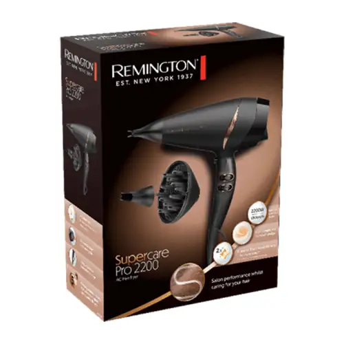 سشوار رمینگتون Supercare مدل AC7200 با موتور AC پرقدرت 2200 وات، طراحی شده برای خشککردن سریع و حالتدهی به انواع موها با فناوری تولید یون منفی برای کاهش وز و افزایش درخشندگی مو است.