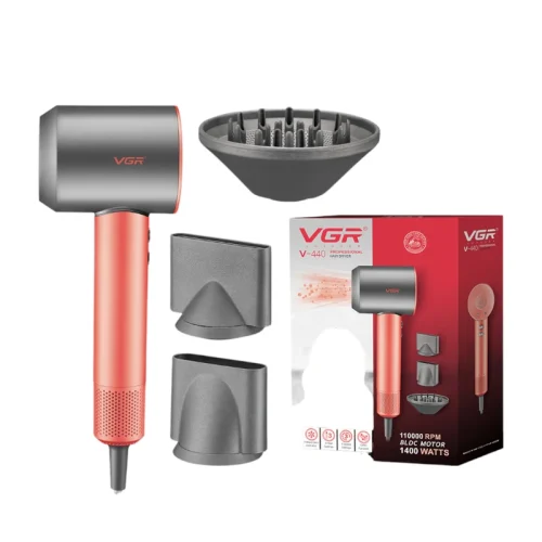 سشوار مسافرتی VGR مدل V-440 با موتور قدرتمند BLDC (حدود 110000 دور در دقیقه)، 1400 وات توان، طراحی تاشو، فناوری یونیک و قابلیت تنظیم سه سرعته و چهار حالتهی دما، همراه با دکمهی باد سرد، انتخابی حرفهای و جمعوجور برای سفر است.